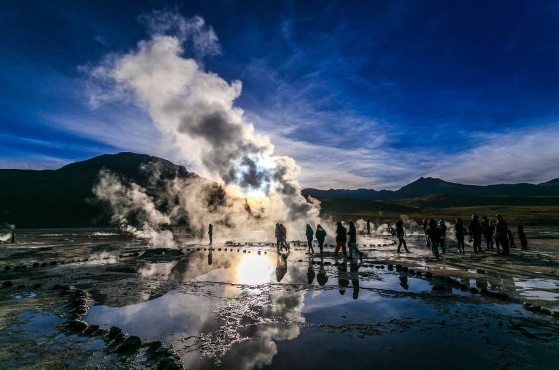 O Geyser del Tatio é o maior campo geotérmico da América do Sul e o terceiro maior do mundo. Localizado a mais de 4.000 metros de altitude no Deserto do Atacama, o lugar surpreende com jatos de vapor e água fervendo que emergem do solo em meio ao frio intenso da manhã.